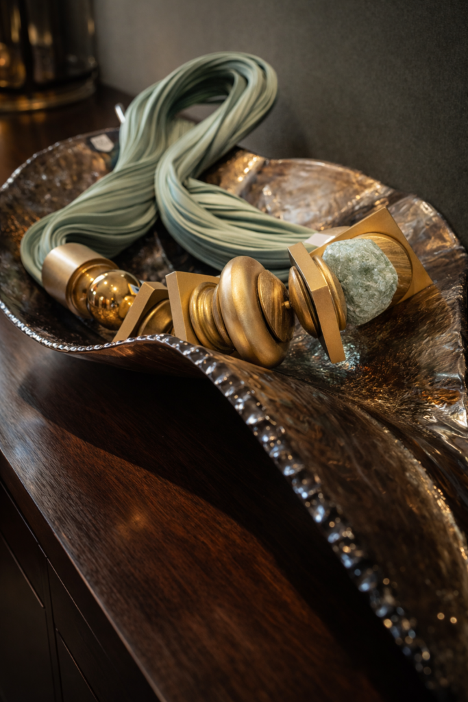 Os colares trazem textura, movimento e um toque artístico único, perfeitos para compor bandejas, aparadores e mesas com leveza e personalidade. Já os centros de mesa assumem o protagonismo, criando pontos de destaque que encantam e organizam o ambiente com elegância.